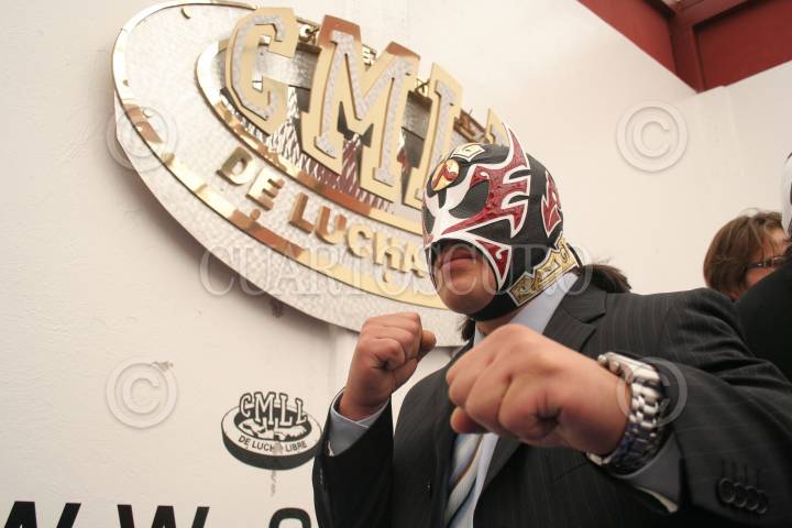 MEXICO D.F. 30AGOSTO2007.- Luchadores estrella integrantes del Consejo Mundial de Lucha Libre se reunieron donde planearon nuevos espectáculos. Lizmark jr. se toma una foto con un fan durante el evento. FOTO: ISAAC ESQUIVEL/CUARTOSCURO.COM