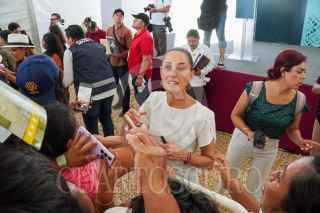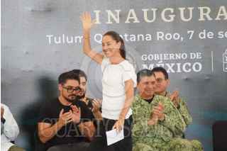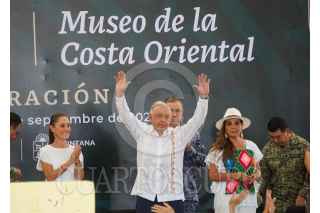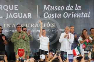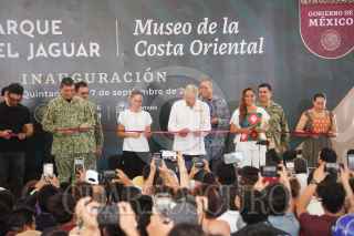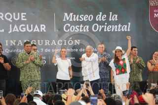 TULUM, QUINTANA ROO, 07AGOSTO2024.- Luis Cresencio Sandoval, secretario de la Defensa Nacional; Claudia Sheinbaum, presidenta electa de México; Andrés Manuel López Obrador, presidente de México; Mara Lezama, gobernadora de Quintana Roo, y María Luisa Albores González, secretaria de Medio Ambiente y Recursos Naturales, encabezaron la inauguración del "Parque del jaguar: Museo de la Costa Oriental". FOTO: ELIZABETH RUIZ/CUARTOSCURO.COM