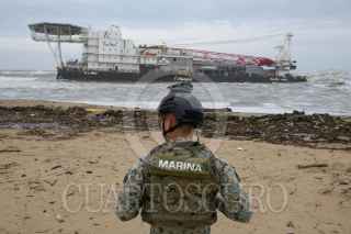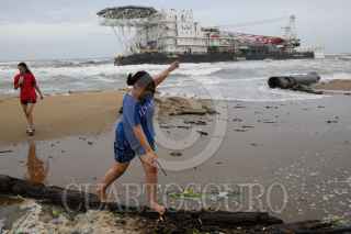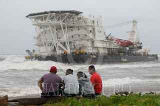 COATZACOALCOS, VERACRUZ, 08SEPTIEMBRE2024.- El frente frío 1 y su interacción con la onda tropical 1 provocaron fuerte oleaje, vientos y lluvia intensa en la zona sur de Veracruz causando que la embarcación Tog Mor encallara cerca de la playa de Villa Allende. Personas curiosas por el hecho se acercaron para ver a la gran embarcación que estaba siendo golpeada por el fuerte oleaje. FOTO: ÁNGEL HERNÁNDEZ/CUARTOSCURO.COM