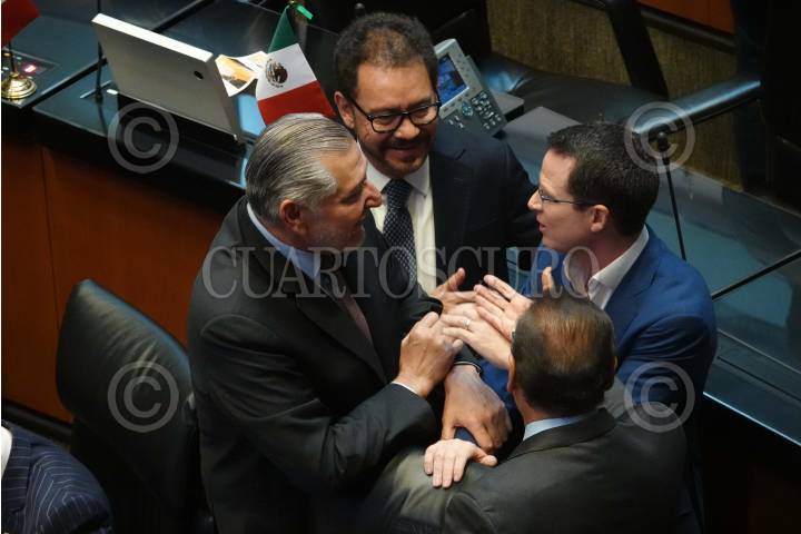 CIUDAD DE MÉXICO, 10SEPTIEMBRE2024.- Los senadores morenistas Adán Augusto López e Ignacio de Mier conversan con el panista Ricardo Anaya, durante el inicio de la discusión de la Reforma Energética en el Senado. FOTO: GRACIELA LÓPEZ/CUARTOSCURO.COM