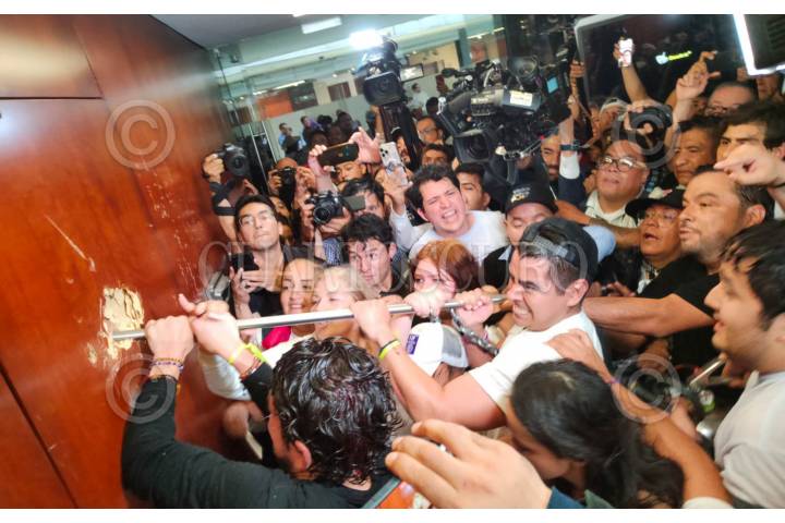 CIUDAD DE MÉXICO, 10OCTUBRE2024.- Manifestantes irrumpieron en el pleno del Senado cuando estaba la discusión de la Reforma al Poder Judicial, los inconformes se identicaron como trabajadores y estudiantes que se oponen a esta medida. Con un tubo y a empujones lograron tirar la puerta del pleno del Senado, personal de seguridad intentaron repelerlos con extintores. FOTO: GRACIELA LÓPEZ/CUARTOSCURO.COM