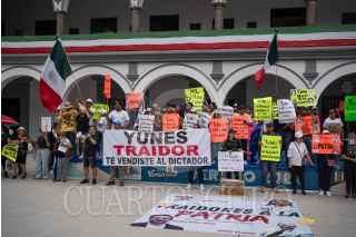 VERACRUZ, VERACRUZ, 11SEPTIEMBRE2024. Trabajadores del Poder Judicial de la Federación (PJF), en Veracruz, se manifestaron a las afueras del palacio municipal con pancartas y actos en contra del senador panista, Miguel Ángel Yunes Márquez, luego de que votara a favor de la reforma judicial propuesta por el presidente, Andrés Manuel López Obrador. Previo a la manifestación, todos los trabajadores del ayuntamiento así como la alcaldesa Patricia Lobeira, esposa de Yunes Márquez, desalojaron el inmueble que fue resguardado por elementos policiales. FOTO: VICTORIA RAZO/CUARTOSCURO.COM