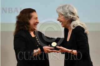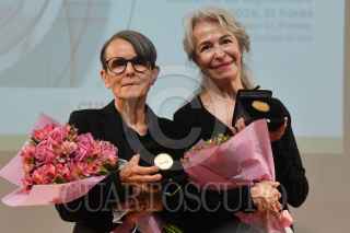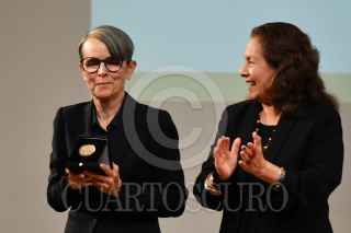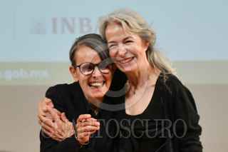 CIUDAD DE MÉXICO, 11SEPTIEMBRE2024.-Pura López Colomé, poeta y escritora, y Verónica Murguía, escritora, se abrazan luego de recibir la "Medalla Bellas Artes" en la rama de literatura. El evento fue realizado en la sala Manuel M. Ponce del Palacio de Bellas Artes. FOTO: MARIO JASSO/CUARTOSCURO.COM