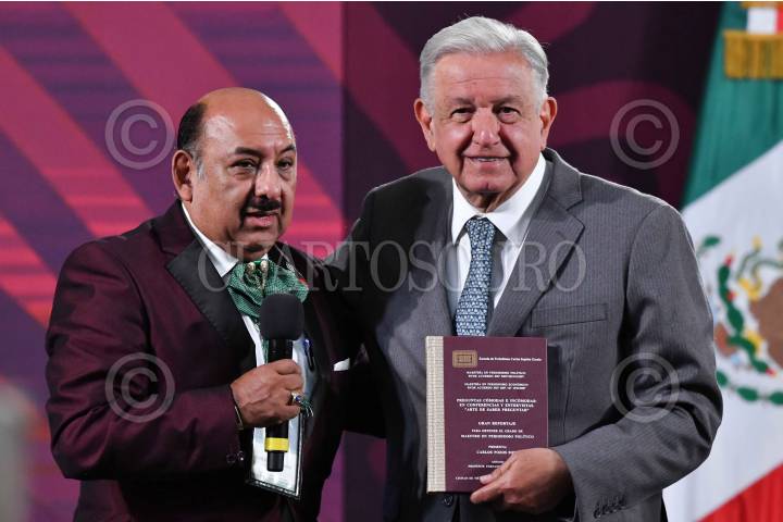 CIUDAD DE MÉXICO, 17SEPTIEMBRE2024.- Andrés Manuel López Obrador, presidente de México, junto al periodista independiente Carlos Pozos "Lord Molécula" quién momentos antes solicitó al mandatario firmara su tesis titulada "Preguntas cómodas e incómodas: en conferencias y entrevistas. Arte de saber preguntar". FOTO: MARIO JASSO/CUARTOSCURO.COM