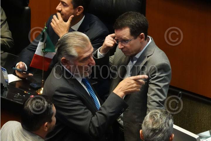 CIUDAD DE MÉXICO, 18SEPTIEMBRE2024.- Los senadores Adán Augusto y Ricardo Anaya se saludaron durante la Sesión Ordinaria en la que se discutió el decreto por el que se Reforma la fracción VII del artículo 74 de la Ley Federal del Trabajo. FOTO: GRACIELA LÓPEZ /CUARTOSCURO.COM