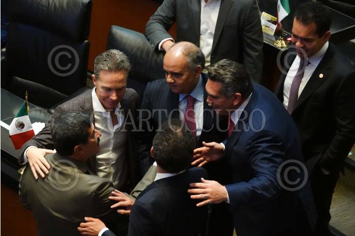 CIUDAD DE MÉXICO, 18SEPTIEMBRE2024.- Los senadores Ignacio Mier, Manuel Velasco, Javier Corral, Manuel Añorve y Alejandro Moreno, durante la Sesión Ordinaria en la que se discutió el decreto por el que se Reforma la fracción VII del artículo 74 de la Ley Federal del Trabajo. FOTO: GRACIELA LÓPEZ /CUARTOSCURO.COM