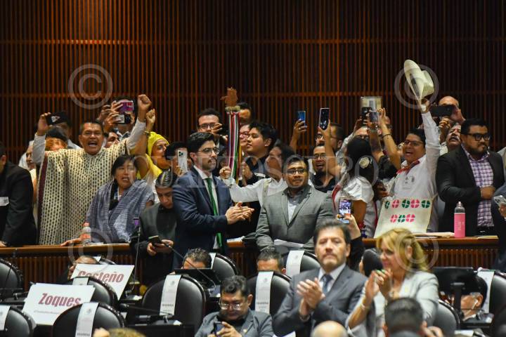 CIUDAD DE MÉXICO, 18SEPTIEMBRE2024.-Con 492 votos a favor, se aprobó en lo general la reforma, que adiciona y deroga el artículo 2o. de la Constitución Política de los Estados Unidos Mexicanos, en materia de pueblos y comunidades indígenas, así como afromexicanos. En la imagen, invitados de comunidades indígenas festejan los resultados de la votación. FOTO: MARIO JASSO/CUARTOSCURO.COM