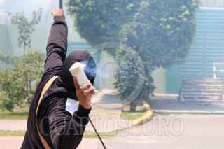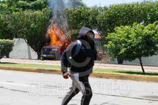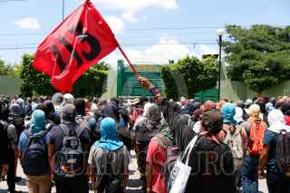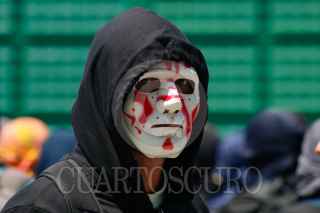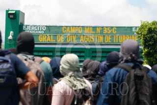 CHILPANCINGO, GUERRERO, 20SEPTIEMBRE2024.- Estudiantes normalistas de la Normal Rural “Raúl Isidro Burgos” de Ayotzinapa, Guerrero, derribaron el muro de la zona militar de Iguala y lanzaron petardos a su interior durante el tercer día de la jornada de lucha rumbo a los 10 años de la desaparición de sus 43 compañeros. Anteriormente, padres y madres de los estudiantes desaparecidos realizaron un mitin en la zona militar. Los jóvenes con el rostro cubierto utilizaron na camioneta de color rojo como ariete para derribar el muro derecho de la entrada principal. FOTO: DASSAEV TÉLLEZ ADAME/CUARTOSCURO.COM