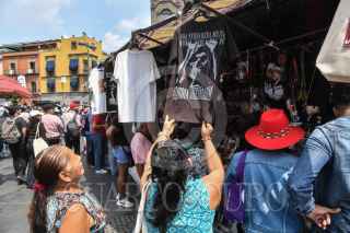 CIUDAD DE MÉXICO, 20SEPTIEMBRE2024.- Dos mujeres observan una playera de la santa muerte con la leyenda: "Una verdadera mujer nunca habla mal de Claudia Sheinbaum", exhibida en un puesto ambulante en las inmediaciones de Palacio Nacional. FOTO: MARIO JASSO/CUARTOSCURO.COM