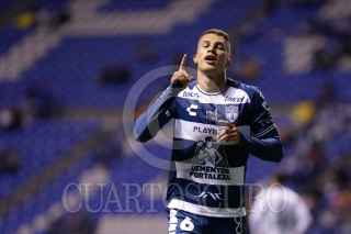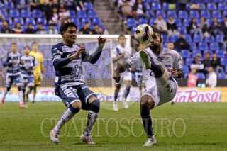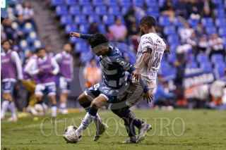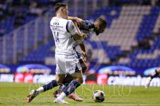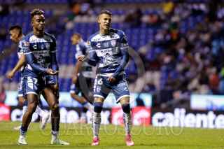 PUEBLA, PUEBLA, 20SEPTIEMBRE2024.- Elías Montiel y Brayan Angulo durante el partido entre el Club Puebla y los los Tuzos del Pachuca, correspondiente a la jornada 9 del torneo Apertura 2024 de la Liga BBVA MX, celebrado en el Estadio Cuauhtémoc. FOTO: MIREYA NOVO/ CUARTOSCURO.COM