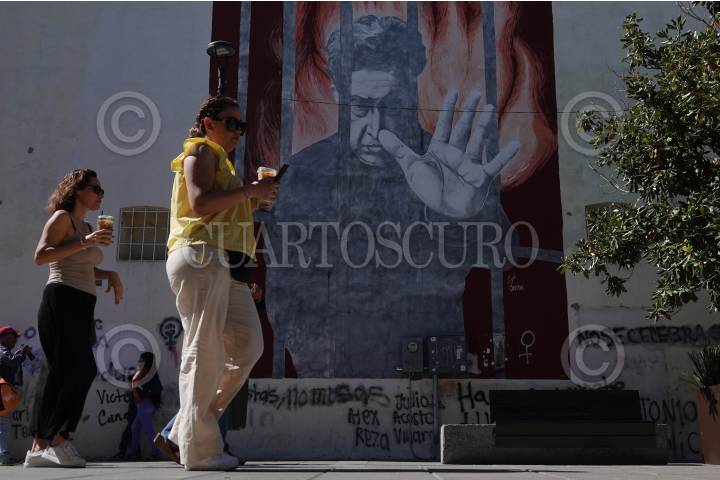 CHIHUAHUA, CHIHUAHUA, 21SEPTIEMBRE2024.- Personas caminan frente al mural que emula la icónica fotografía de David Alfaro Siqueiros en Lecumberri del fotógrafo mexicano Héctor García, en el centro de Chihuahua. FOTO: GALO CAÑAS/CUARTOSCURO.COM