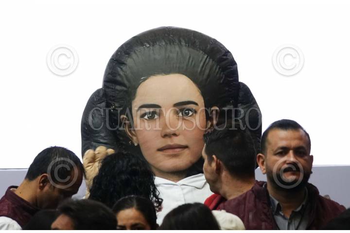 CIUDAD DE MÉXICO, 22SEPTIEMBRE2024.- Una botarga de Luisa María Alcalde Luján, secretaria de Gobernación, durante el Séptimo Congreso Nacional Extraordinario de Morena realizado en el World Tarde Center. FOTO: GRACIELA LÓPEZ /CUARTOSCURO.COM
