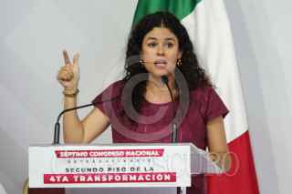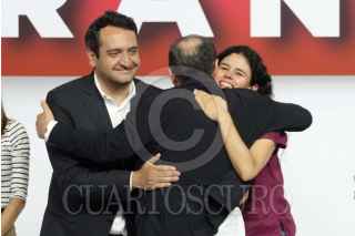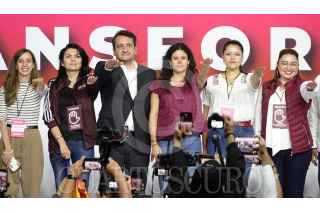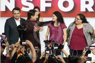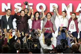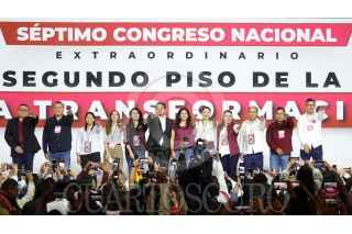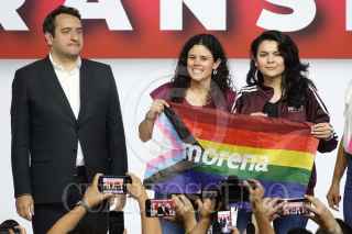 CIUDAD DE MÉXICO, 22SEPTIEMBRE2024.- Durante el Séptimo Congreso Nacional Extraordinario de Morena tomaron protesta para cargos del partido: Arturo Martínez Núñez, secretario de Artes y Cultura; Camila Martínez Gutiérrez, secretaria de Comunicación; Andrés Manuel López Beltrán, secretario de Organización; Luisa María Alcalde Luján, presidenta; Carolina Rangel Gracida, secretaria General; Manuel Alejandro Robles Gómez, secretario de Mexicanos en el Exterior; Aaron Enriquez García, secretario de Jóvenes, y Iván Herrera Zazueta, secretario de Finanzas. El acto se realizó en el World Trade Center. FOTO: GRACIELA LÓPEZ /CUARTOSCURO.COM