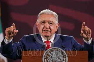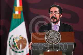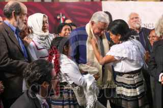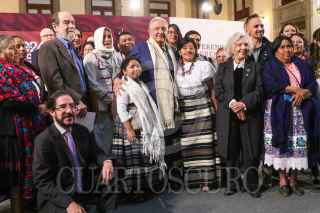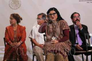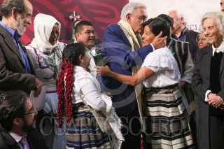CIUDAD DE MÉXICO, 23SEPTIEMBRE2024.- El flautista Horacio Franco y la escritura Elena Poniatowska conversan previo al inicio de la conferencia mañanera en Palacio Nacional. FOTO: MOISÉS PABLO/CUARTOSCURO.COM