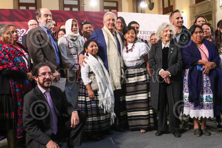 CIUDAD DE MÉXICO, 23SEPTIEMBRE2024.- Integrantes del Consejo Indigena para la Conservación y Preservación del Patrimonio Cultural se tomaron la foto con el Presidente de México, Andrés Manuel López Obrador, tras la conclusión de la mañanera. FOTO: MOISÉS PABLO/CUARTOSCURO.COM