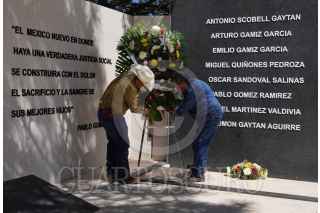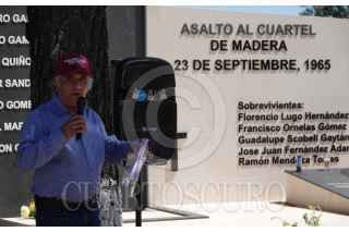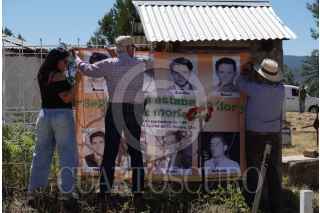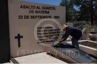 MADERA, CHIHUAHUA, 23SEPTIEMBRE2024.- Familiares colocan una lona con los rostros de los guerrilleros: Arturo Gámiz García, Pablo Gómez Ramírez, Emilio Gámiz García, Antonio Scobell Gaytán, Oscar Sandoval Salinas, Miguel Quiñones Pedroza, Rafael Martínez Valdivia y Salomón Gaytán durante la ceremonia con motivo del 59 aniversario del asalto al Cuartel Madera, en el mausoleo ubicado en el panteón municipal de la entidad. FOTO: GALO CAÑAS/CUARTOSCURO.COM