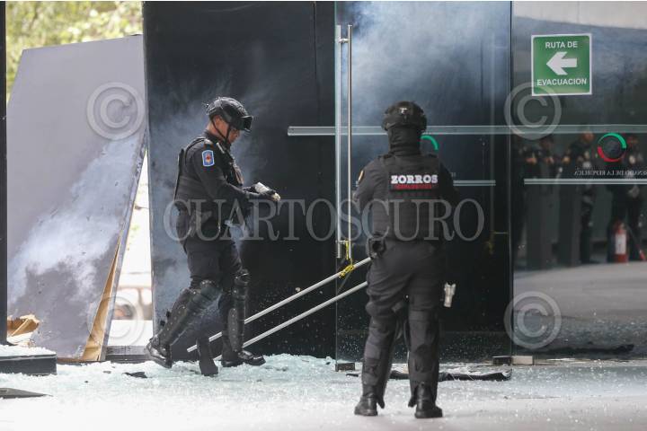 CIUDAD DE MÉXICO, 24SEPTIEMBRE2024.- Elementos del grupo Zorro de la Secretaría de Seguridad Ciudadana (SSC) retiraron los petardos que no explotaron y que fueron lanzados por normalistas de Ayotzinapa al interior del Senado, quienes se manifestaron en las inmediaciones de este recinto en el marco del décimo aniversario de la desaparición de los 43 normalistas de la Escuela Normal Rural Raúl Isidro Burgos. FOTO: CUARTOSCURO.COM
