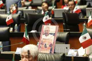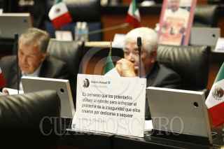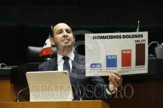 CIUDAD DE MÉXICO, 25SEPTIEMBRE2024.- La bancada panista mostró su rechazo a la ley que reintegra a la Guardia Nacional al mando de la Sedena, ya que ellos señalan que esto es militarizar la seguridad del.pais, además de que no se ha resuelto el problema del combate a la violencia, esto durante la sesión en la que se aprobó está disposición. En la imagen Marko Cortés muestra la cifras de homicidios dolosos en los últimos cuatro sexenios y destaca que en la época de Morena estos han subido considerablemente. FOTO: CUARTOSCURO.COM