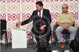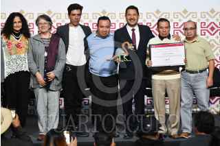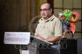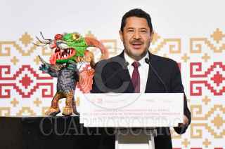 CIUDAD DE MÉXICO, 25SEPTIEMBRE2024.- Martí Batres, jefe de Gobierno, encabezó la ceremonia de reconocimiento en el marco de la declaratoria de patrimonio cultural intangible a los alebrijes de Pedro Linares. Los acompaña: Susana Harp, senadora; Marta Turok, antropóloga; Argel Gómez Concheiro, encargado de despacho de la Secretaría de Cultura, y Leonardo Linares. FOTO: MARIO JASSO/CUARTOSCURO.COM