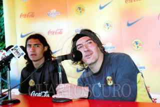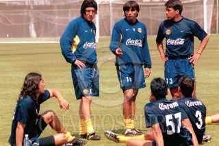 Ivan Zamorano y el Chuy Mendoza conversan con sus compañeros durante el entrenamiento del Club América. FOTO: Pedro Mera/CUARTOSCURO.COM