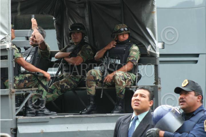 MÉXICO, D.F. 02SEPTIEMBRE2007.- Simpatizantes de Andrés Manuel López Obrador se manifestaron afuera de Palacio Nacional, fueron rodeados por granaderos mientras el presidente Felipe Calderón Hinojosa rendía su informe a la nación. FOTO:PAOLA HIDALGO/CUARTOSCURO.COM