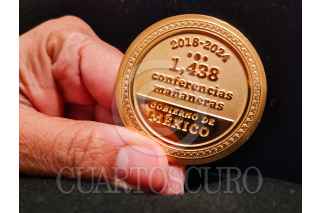 CIUDAD DE MÉXICO, 30SEPTIEMBRE2024.- Moneda conmemorativa por las 1,438 mañaneras de Andrés Manuel López Obrador, Presidente de México, fue distribuida como obsequio entre los periodistas que cubrieron una gran cantidad de las mismas durante los actos conmemorativos por el fin de su gestión. FOTO: CUARTOSCURO.COM