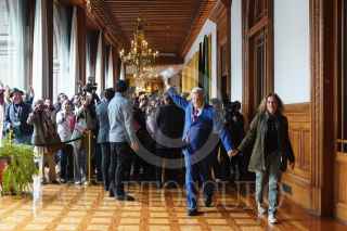 CIUDAD DE MÉXICO, 30SEPTIEMBRE2024.- Andrés Manuel López Obrador, Presidente de México, y su esposa Beatriz Gutiérrez Müller, de despiden tres atender a los medios después de develar el retrato del tabasqueño en los pasillos de Palacio Nacional. FOTO: PRESIDENCIA/CUARTOSCURO.COM