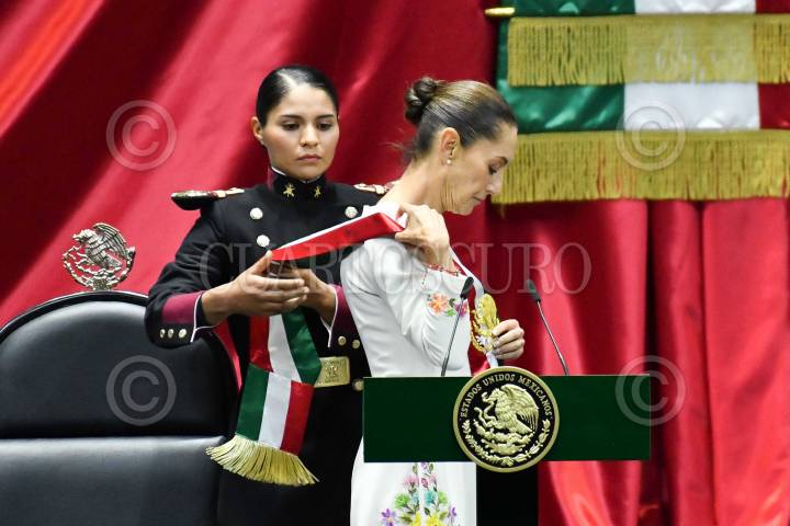 CIUDAD DE MÉXICO, 01OCTUBRE2024.- Una mujer cadete coloca a la banda presidencial a Claudia Sheinbaum, quien tomó protesta como Presidenta Constitucional de los Estados Unidos Mexicanos, durante la sesión de Congreso General realizada en la Cámara de Diputados. FOTO: MARIO JASSO/CUARTOSCURO.COM