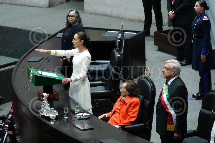 CIUDAD DE MÉXICO, 01OCTUBRE2024.-Claudia Sheinbaum Pardo rindió protesta ante el pleno de la Cámara de Diputados como la nueva presidenta de México. La banda presidencial le fue entregada de manos de la presidenta de la Cámara, Ifigenia Martínez y del presidente saliente Andrés Manuel López Obrador. FOTO: GALO CAÑAS/CUARTOSCURO.COM