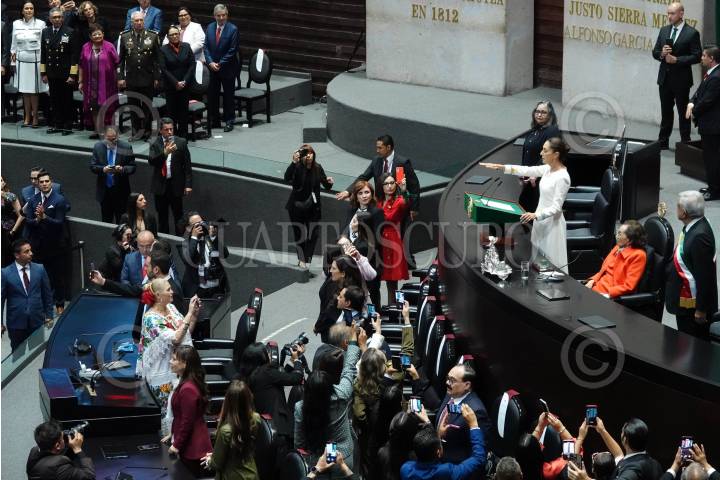 CIUDAD DE MÉXICO, 01OCTUBRE2024.-Claudia Sheinbaum Pardo rindió protesta ante el pleno de la Cámara de Diputados como la nueva presidenta de México. La banda presidencial le fue entregada de manos de la presidenta de la Cámara, Ifigenia Martínez y del presidente saliente Andrés Manuel López Obrador. FOTO: GALO CAÑAS/CUARTOSCURO.COM