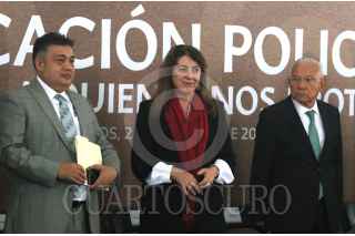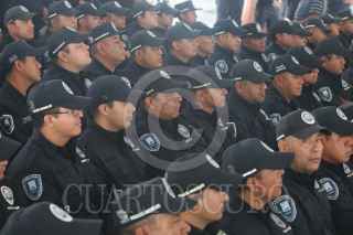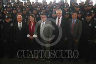 CUERNAVACA, MORELOS, 02OCTUBRE2024.- Policías de Morelos durante el evento de "Dignificación policial", donde la gobernadora Margarita González Saravia, anunció que en el arranque de su administración se aumentará en un 30% el sueldo, buscando que año con año se incremente para tener un salario digno. En la imagen la mandataria estatal flanqueada por Ángel Urrutia, secretario de Seguridad y Juan Salgado Brito, secretario de Gobierno,. FOTO: MARGARITO PÉREZ RETANA/CUARTOSCURO.COM